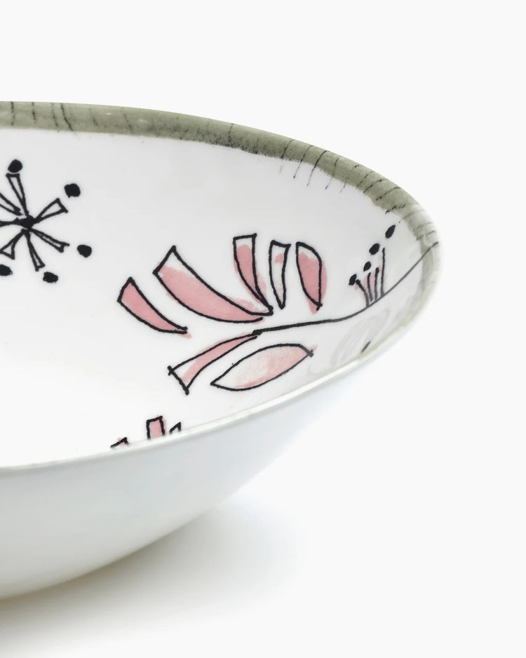 Indulge in the botanical beauty of Low bowl Fiore Rosa Midnight Flowers. Hand-applied illustrations in striking shades of green and blue adorn these porcelain bowls. Their slightly asymmetrical shapes enhance the premium quality of the design. A truly exquisite addition to your table.