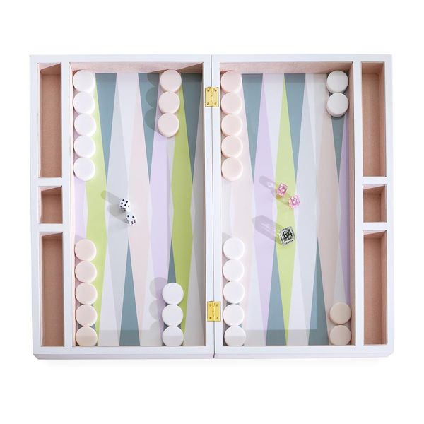 This luxurious backgammon game from Jonathan Adler has a geometric pattern design in cream, pink, light blue and light green. This game can always be on display. Dont store it away. It's very beautiful!