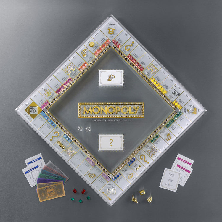 The 3/8" thick tempered glass game board features gold and silver foil printing for a truly exquisite touch. Enjoy a stunning tribute to this iconic property trading game in spectacular style.