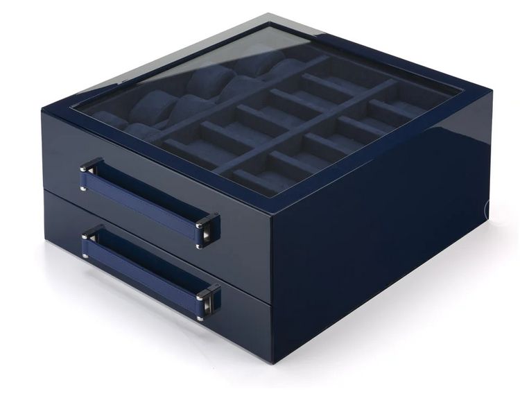 The lower drawer is made for rings, cufflinks, and other treasures, with a flexible compartment for personal keepsakes.