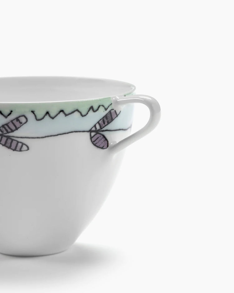 Sip your morning brew from this Marni tall coffee cup, showcasing a delicate pink and blue floral design on Fine Bone China porcelain. Each piece features hand-crafted details that add a touch of whimsy to your daily routine. Wake up with a smile (and caffeine, of course)!