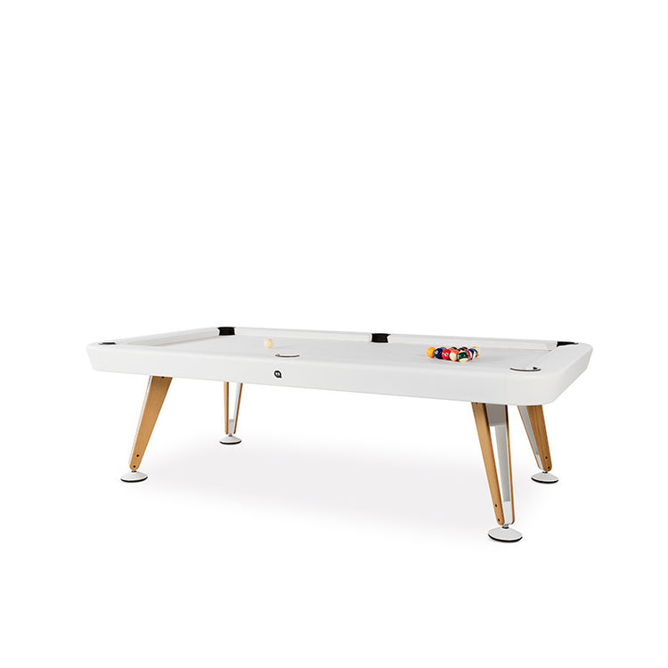 You can store all accessories in the Diagonal floor cue rack outdoor version. And if you’d also like to use the pool table as a dining table, the dining top offers you this double functionality.