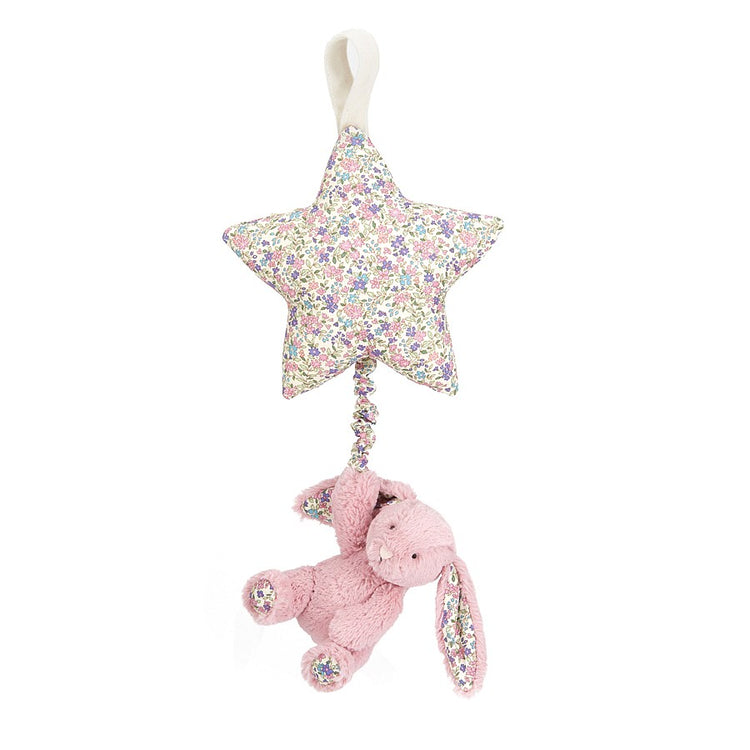 Sailing in on a soft little star, it's the Blossom Tulip Bunny Star Musical Pull. The stargazing bunny is gorgeously grabbable, so little hands can reach and tug.