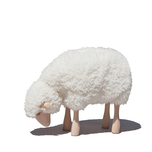 White sheep handmade sculpture with real wool and beechwood