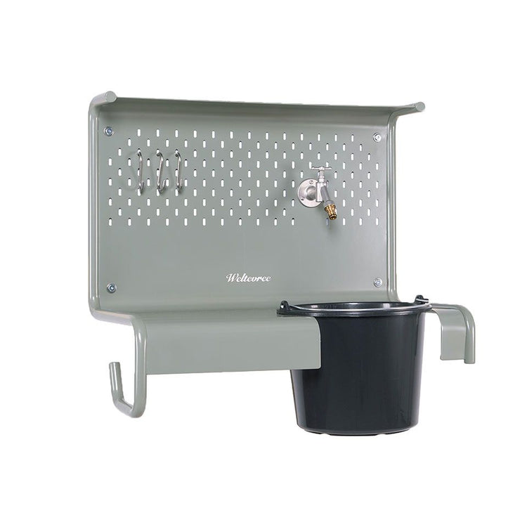 Control the mess around the faucet on the wall. It features counter space, a real faucet, and other organizers, such as a large hook for towels, small hooks for gardening supplies, and a top shelf. Get your Outdoor Sink Counter!