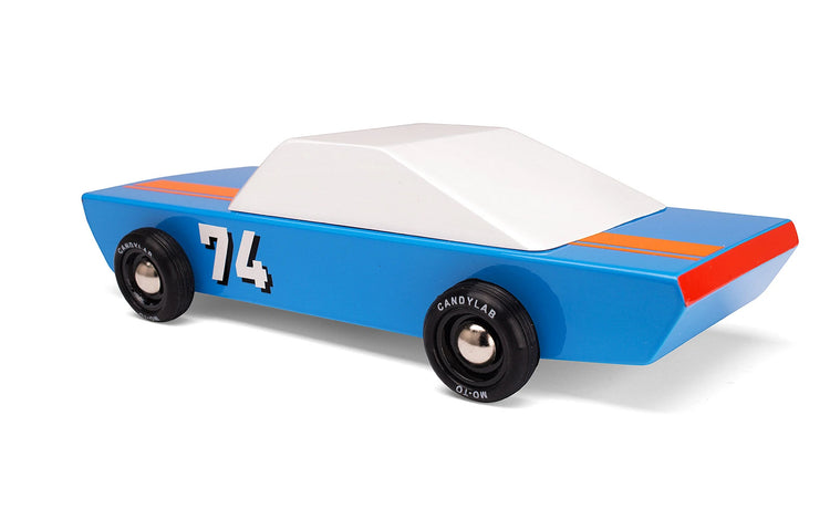 With its superb black rims and its fat wide rear ties, this fast child racing car is painted with a sleek and modern look design.