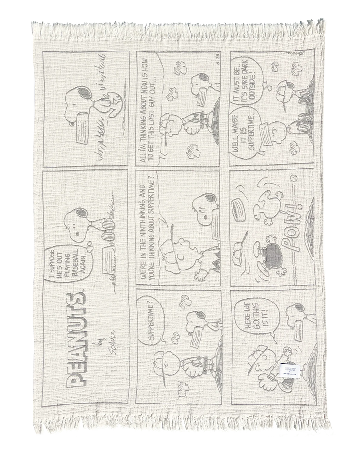 Step right into the world of Charlie Brown and Snoopy with this life-sized Peanuts comic strip blanket, inspired by the beloved artwork of Charles M. Schulz.
