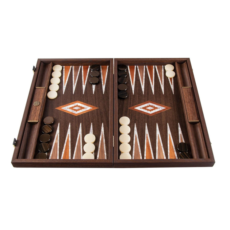 This beautiful backgammon is an object to admire, made from Wenge, Mahogany & Walnut with pearl elements. A luxury backgammon made from natural materials.