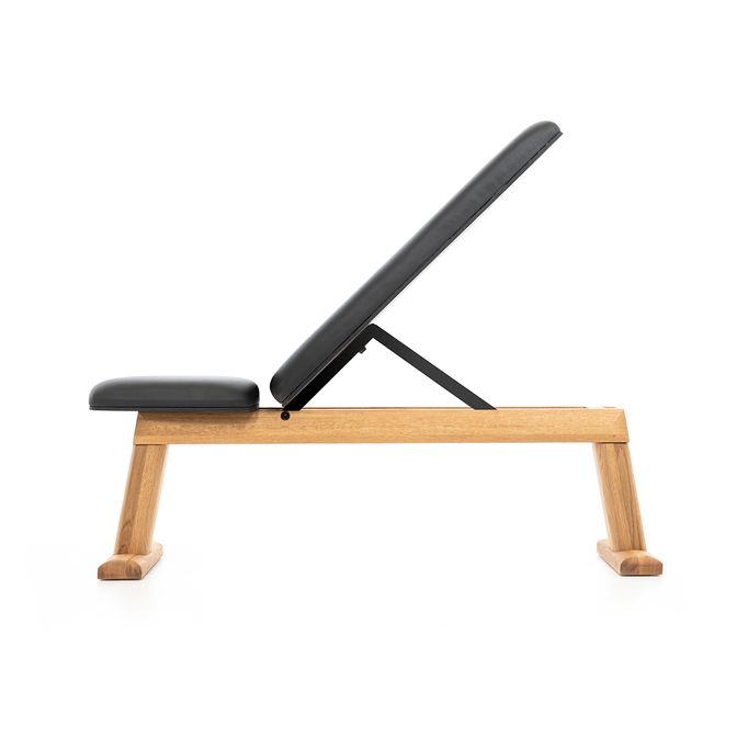 The solid wood frame impresses with its stability. It comes with a handcrafted leather seat bed giving the weight bench a solid character that fits into any room.