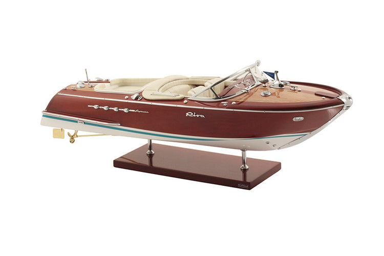 Experience the luxury of the Riva Aquarama with this exceptional maquette, handmade from real wood and marine saddlery. The chrome-plated brass fittings, 10 coats of varnish, and ivory upholstery add to its authenticity.