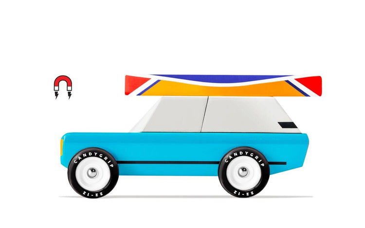 Candylab's mission is to embrace your child's imagination and creativity, these cars don't include batteries; you and your child are in charge of the adventure and the story. It comes with a magnetic surfboard and tow hook, this car model comes in two colours: Gold, and blue.